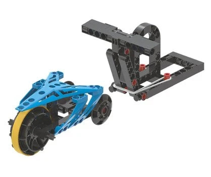 Set up a launching device that propels a motorcycle across the floor at the push of a lever.