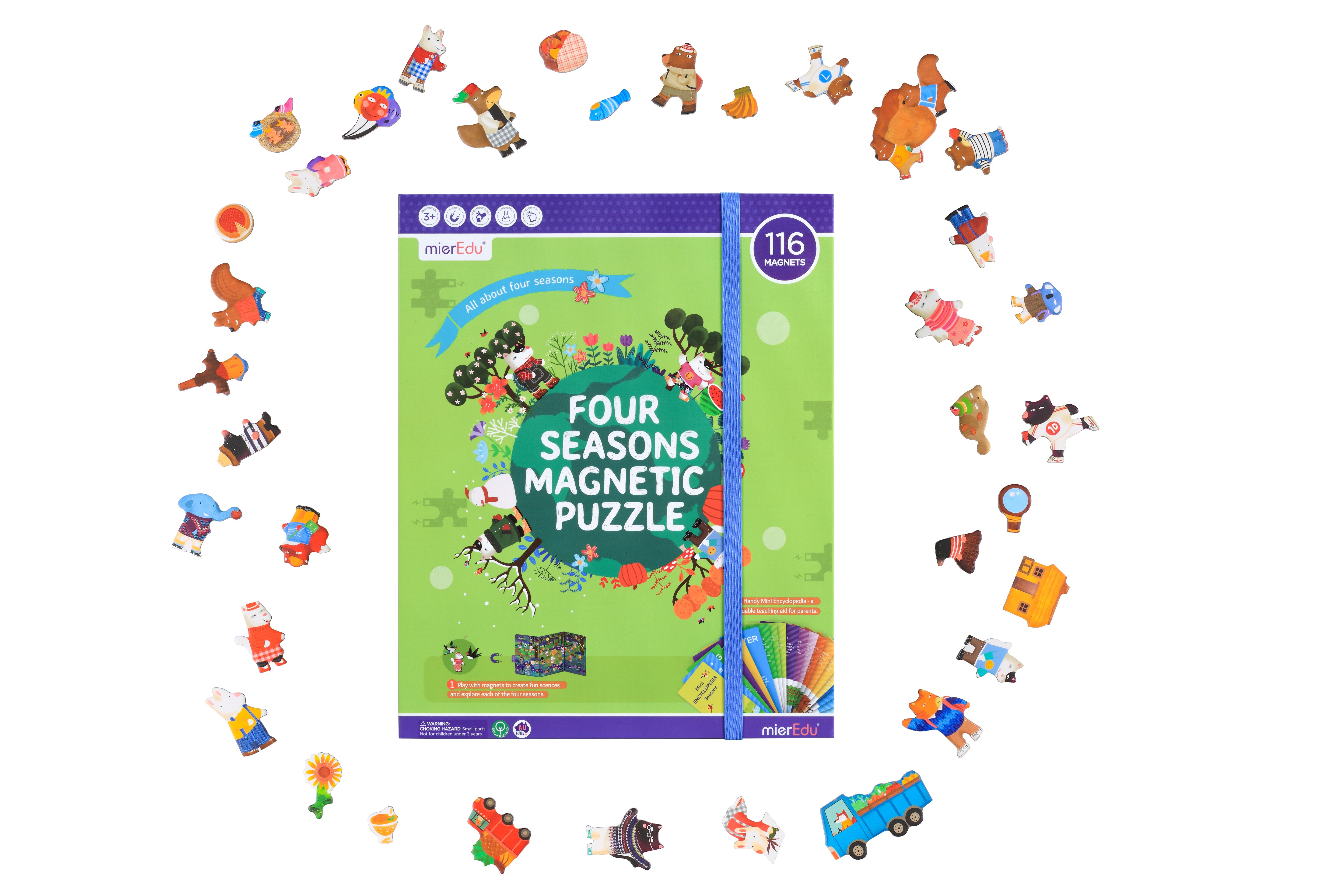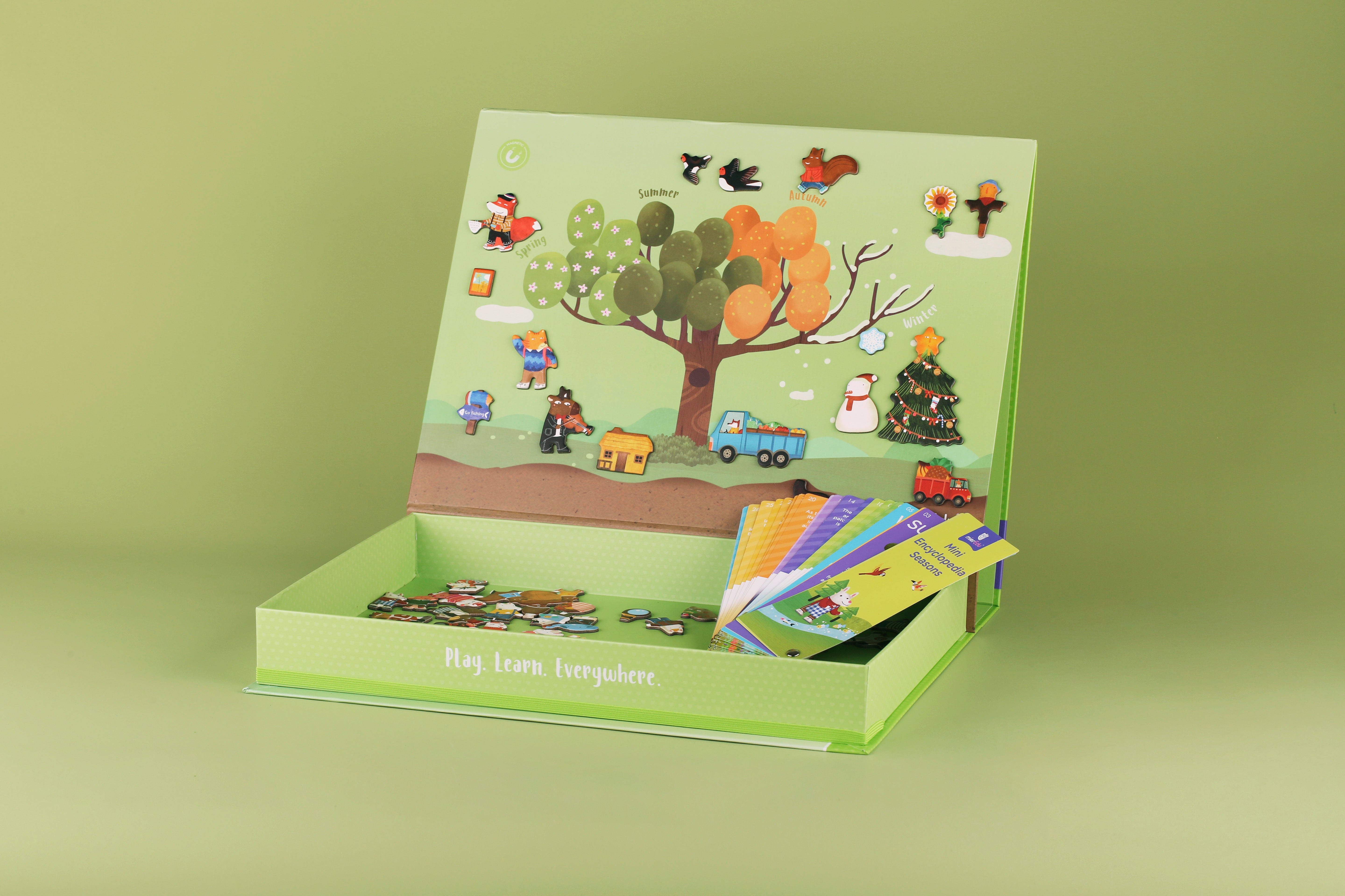 This delightful, in-depth exploration of the four seasons puts a wealth of creative play and learning activities at kids' fingertips, with a great many developmental benefits to be reaped along the way. Included are 116 gorgeously-illustrated magnetic pieces, the unique shapes and imagery of which give youngsters a cast of animal characters and assorted objects with which to populate the four scenes displayed on the set's double-sided playboards. Each side of the illustrated boards shows a different outdoor setting representative of one of the four seasons and to which children attach the magnets to complete the scene. This can be done improvisationally or through a game-like approach in which children emulate detailed pictures that display the seasonal settings with the magnets already incorporated. The set's Mini Encyclopedia introduces a variety of fun facts and interactive Q & A lessons into an already multifaceted play process through which kids strengthen important skills such as visual, tactile, creative, critical thinking, communication and motor skills.