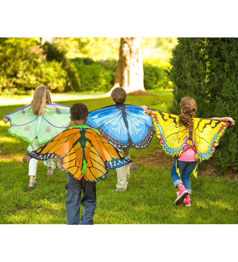 How’s the view from the sky? Kids need only slip on these fabric wings to imagine what it’s like to fly up, up, and away on a magical journey through the clouds. Inspired by real butterfly colours and shapes, the wings are also designed.