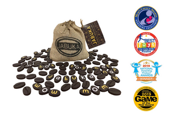 The innovative twist to JABUKA is that the coffee bean-shaped pieces with yellow characters can be twisted and turned to form different letters, magically transforming J's into r's, M's into E’s and many more!