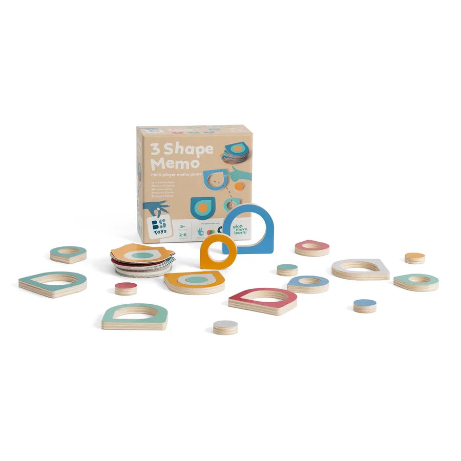 The award-winning BS Toys 3 Shape Memo Game is a brilliant memory and logic challenge that combines strategic thinking with fast-paced, hands-on fun. Each player draws a memo card showing a three-piece puzzle, then races to build the correct configuration using the shared wooden pieces. But here’s the twist – the shapes are double-sided, so players must flip and rotate pieces to uncover the colours and shapes they need. It’s a test of memory, coordination and quick thinking!