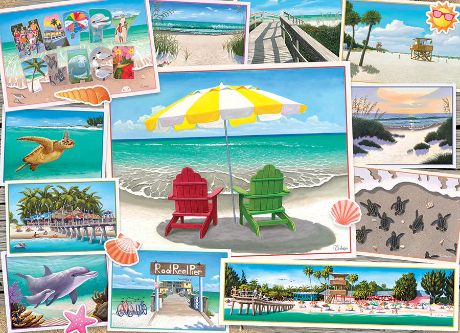 For so many, their Happy Place is a sunny day on the beach. Umbrellas up, chairs out, a stroll on the pier with the hopeful possibility of seeing sea life. Would you be happy to receive a postcard from this serene beach scene or would you rather be there in person? A 1000 piece scenic beach collage puzzle.